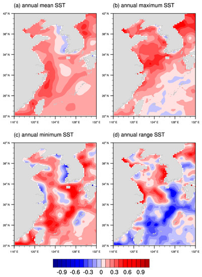 We also estimate the trends distribution of annual minimum and maximum SST in the study region (Figure 5b,c). Comparing to the rapid warming of minimum SST in the range of the ECS-Kuroshio and the Yangtze River estuary, the maximum SST shows clear increasing in the most part from the northern ECS to the Bohai Sea. The inter-annual SST variability in the ECSs is not only associated with large-scale climate oscillations in the Pacific (for instance, Pacific Decadal Oscillation, North Pacific Oscillation, East Asia Monsoon, ENSO, etc.) but also affect by many local processes, including the Yangtze River discharge, Kuroshio, and East Asian Monsoon, etc. The complex local processes may lead to regional differences in trends. Wu et al. [6] related the phenomenon of high SST increasing trend along the western Pacific marginal seas to the poleward shift and the intensification of the Kuroshio. In boreal winters, weakening northeasterly winds after 1982 would strengthen the northward advection of the Kuroshio and its cross-shelf currents into the ECS, due to a strong southward upper Ekman drift [31]. It is actually coincident with the finding that a rapid warming of annual minimum SST in the range of the ECS-Kuroshio. As shown in Figure 5d, there is an out-of-phase change on both sides of 30° N (Figure 5d). The AR SST is notably weakened in the band of the ECS-Kuroshio, with the decreasing center located at (127–128° E, 28-30° N). The decrease of the AR SST is associated with a rapid warming of the minimum SST and the slow warming of the maximum SST. AR SSTs in the Bohai Sea and the Yellow Sea are increasing, except some much small areas.