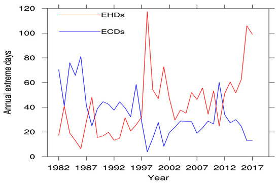 Regional averaged annual EHDs (red line) and ECDs (blue line) from 1982 to 2017 in the study region (units: days).