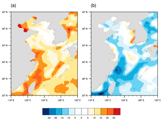 Spatially, the significant high warming rates of the annual mean SST appear in the western ECS and part of the ECS-Kuroshio, exceeding 0.2 °C per decade (Figure 5a). In them, warming rates of the Yangtze River estuary are especially large, up to 0.4 °C per decade. The rapid warming in the western ECS coincides with the previous findings [7,8]. Studies pointed that the stream temperature in the vicinity of the Yangtze Estuary had increased by ~2 °C since 1986, thereby contributing to the extremely rapid warming observed in the western ECS [4,36]. However, the other significant warming at the ECS-Kuroshio has not been captured using the coarse SST grid dataset in the previous studies. There are weak cooling trends occurs in the west of the Korea Island in Figure 5a which were not clearly shown in the previous studies and needs a further investigation.