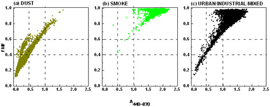Scatter plot of fine-mode fraction (FMF) versus Ångstöm exponent for the pair of wavelength 440 and 870 nm (Å440-870) for (a) dust sites, (b) smoke sites and (c) urban/industrial/mixed sites. Thresholds of Å440-870 <0.4 and FMF <0.4 are used to determine the dust particles, Å440-870 >1.0 is used to distinguish the smoke particles, 0.4 <FMF <0.6 is used to distinguish the mixed particles and FMF > 0.6 is used to distinguish the pollution particles at the respective sites of each aerosol type.