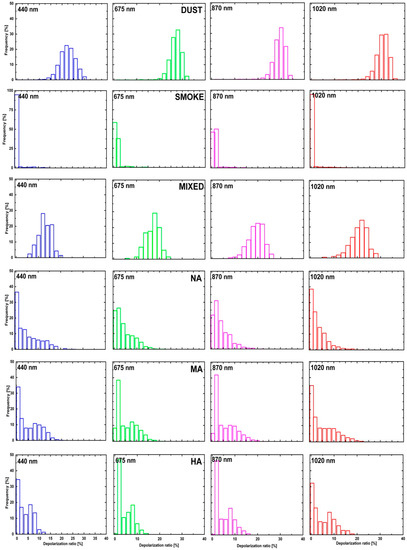 Frequency distribution of the spectral depolarization ratio for dust, smoke, mixed, non-absorbing (NA), moderate-absorbing (MA) and high-absorbing (HA) pollution particles at 440 (blue), 675 (green), 870 (magenta) and 1020 (red) nm wavelengths, respectively. Statistics for the histograms are provided in Table 3.