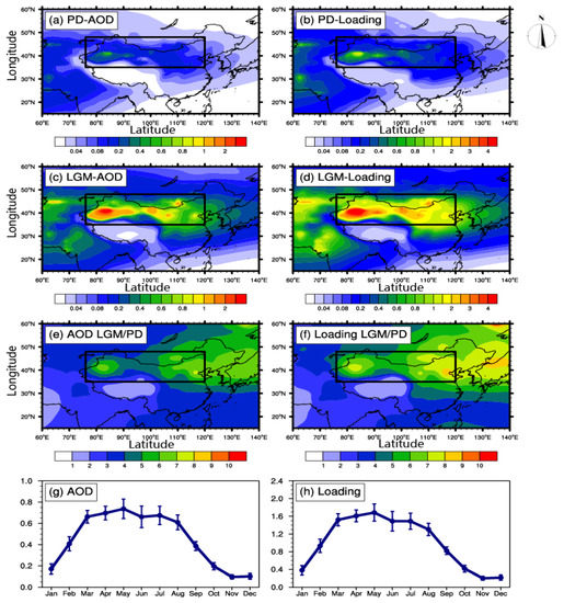 Spatial distributions of the March–April–May (MAM) averaged dust AOD at 550 nm and loading derived from the present-day (PD) and Last Glacial Maximum (LGM) Active experiments. (a) AOD for PD, (c) AOD for LGM, (b) dust loading for PD, unit: g m−2 (d) dust loading for LGM, unit: g m−2, and (e) AOD and (f) loading for LGM/PD. The black rectangle contains the target area of East Asia (35–48° N; 76–120° E). Monthly dust (g) AOD and (h) loading (unit: g m−2) averaged over East Asia.