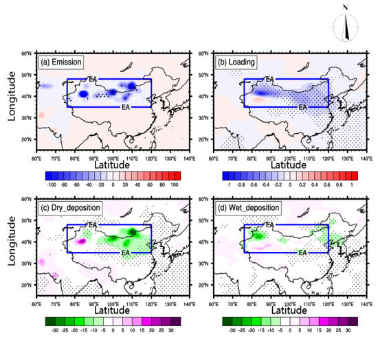Differences in MAM mean of (a) dust emissions (unit: g m−2 season−1), (b) dust loading (unit: g m−2), (c) dust dry deposition (unit: g m−2 season−1), and (d) dust wet deposition (unit: g m−2 season−1) between the LGM Active and Passive experiments. The blue rectangle contains the target area of East Asia (EA, 35–48° N; 76–120° E). The black dots represent the grid points with statistical significance above the 95% level.