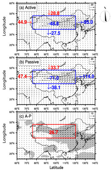 The dust transport flux through the vertical sections from the surface up to the model top in MAM (a) for the LGM Active and (b) LGM Passive (unit: g m−2 s−1) experiments. (c) The difference of the dust transport flux between the LGM Active and Passive experiments (unit: g m−2 s−1). The shadings (c) indicate the dust transport flux variations that are significant at the 95% confidence level. The net mass of dust transported in MAM through the borders of the East Asia region with the transport directions following the arrows (unit: Tg season−1).