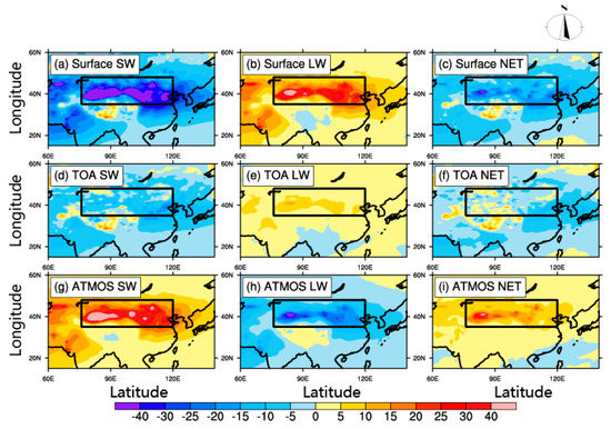 Dust in the atmosphere can directly absorb and scatter thermal (longwave, LW) and solar (shortwave, SW) radiation, known as dust direct radiative forcing (DRF). The importance of DRF has been extensively recognized in current general circulation models [10,11,12]. Globally, the annual mean DRF of dust aerosols at the top of atmosphere (TOA) are estimated to be negative [13], but different in magnitude in different current model simulations. For example, Huneeus et al. [14] suggested that the value of DRF ranged from −0.30 to −0.6 W m−2 by the AeroCOM model. Mahowald et al. [15] deduced changes of −0.14 ± 0.11 W m−2 from the years 1750 to 2000. Kok et al. [9] noted that the DRF was underestimated in models, and revalued its value of −0.2 W m−2 between −0.48 and +0.20 W m−2. The impacts of changes in radiative forcing induced by dust aerosol on thermal stratification and air pressure lead to changes in surface wind speeds, feeding back to the dust cycles, including dust emission, loading, transport, and deposition. Miller et al. [16] and Pérez et al. [17] have described this feedback, noting that the DRF reduces the surface net radiation and enhances thermal stability of the planetary boundary layer (PBL), which decreases surface wind speeds.