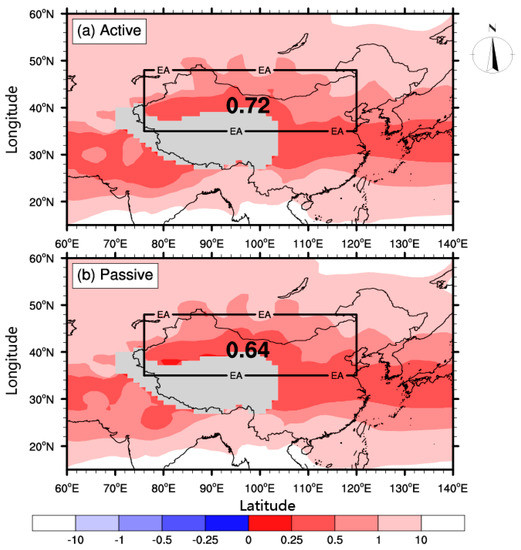 Spatial distributions of the MAM averaged Ri derived from (a) the LGM Active and (b) the LGM Passive numerical experiments. The values in rectangles are the regional mean Ri over East Asia for the corresponding experiment.