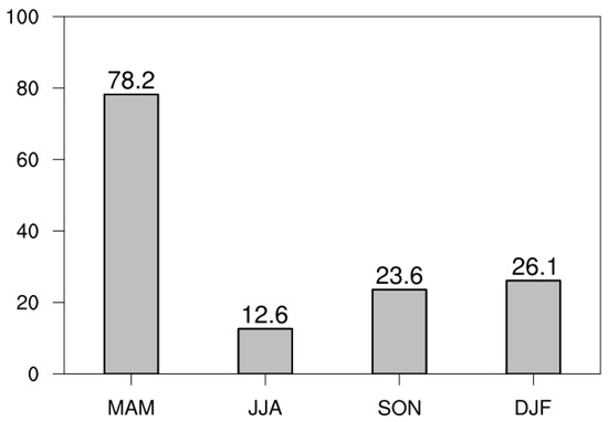 The reduction values in dust emissions (Tg season−1) in four seasons induced by the DRF including MAM, June–July–August (JJA), September–October–November (SON), and December–January–February (DJF).
