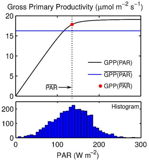 Indeed, we found that GPP calculated from the spatially-averaged PAR was up to 1.5 µmol m−2 s−1 higher (Figure 1, red circle) than the average of GPP calculated from the spatially-variable PAR (Figure 1, blue line). The difference between these two estimates is 24% of the observed standard deviation in daytime half-hourly GPP at a site near Lamont, Oklahoma [43], and indicates the importance of spatial variability in climate drivers of GPP. This likely represents an upper bound on such effects at this site, as the GPP-PAR curve used here has a high degree of nonlinearity to illustrate the utility of our method for a general class of problems. Related problems for which this method is applicable include modeling spatiotemporal variability in soil moisture and leaf area index, and the nonlinear influence of these variables on evapotranspiration and surface energy partitioning [45].