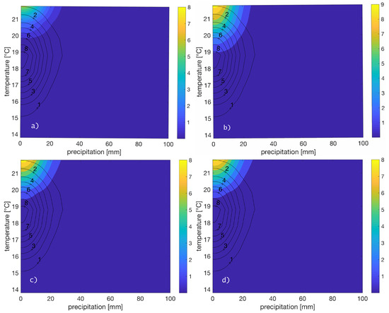 Clear differences can be seen between both stations, indicating different regimes and precipitation-generation processes. From Figure 4, it can be seen that, for LAMU station, low precipitation values are not strongly related to low rainfall rates. The same holds true for high values. Enhanced densities can be found for low rainfall rates and high temperatures. Such features can be partly reflected by only a few of the analyzed parameterization simulations. From Figure 4, for instance, it becomes obvious that WRF-BLA, with its highest density at low precipitation and large temperature values, is not an optimal choice to represent the observed data. Additionally, it can be seen that the same cumulus parameterization scheme (here, Kain–Fritsch) leads to similar empirical copula density functions.