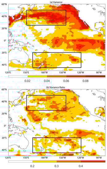 (a) The internal multidecadal variance of sea surface temperature (SST) anomalies in the Pacific. Unit: (°C)2. (b) The ratio between the internal multidecadal variance and total variance of SST. The rectangular boxes in the mid-latitude North and South Pacific are regions in which the indices of the internal multidecadal variability in the North and South Pacific (NPIMV and SPIMV) are defined.