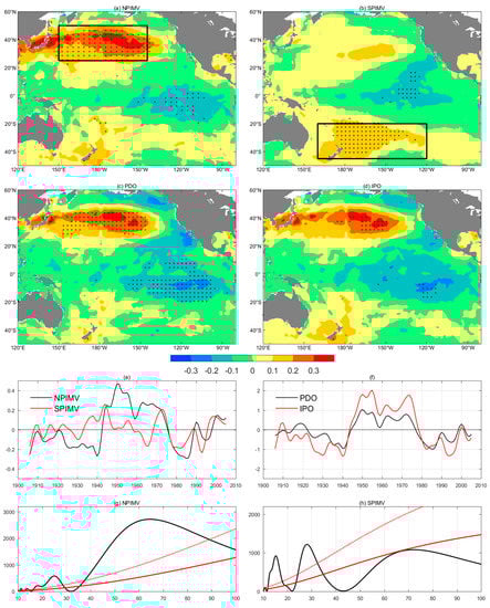 Regressions of SST anomalies onto (a) the NPIMV index, (b) the SPIMV index, (c) the Pacific decadal oscillation (PDO) index, and (d) the interdecadal Pacific oscillation (IPO) index (unit: °C per standard deviation). Values exceeding 90% for the significance test are dotted. (e) Time series of the NPIMV (black curve) and SPIMV (red curve) indices (unit: °C). (f) Time series of the standardized PDO (black curve) and IPO (red curve) indices. The PDO and IPO indices are multiplied by (−1) in order to compare with NPIMV and SPIMV. Power spectrum of (g) the NPIMV index and (h) the SPIMV index are shown. In (g) and (h), the red solid curve is corresponding red noise spectrum and the red dotted curve shows 5% confidence upper limit of the red noise spectrum. The x-axis is period (unit: years) and the y-axis is power.