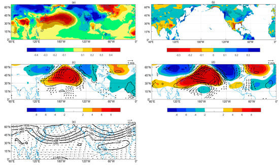 To understand how NPIMV influences the above regions, the responses of the geopotential height and winds at 850 hPa and 500 hPa are diagnosed (Figure 3c,d). In the positive phase of NPIMV, the geopotential height anomaly is positive over the extratropical North Pacific and Mexico, and negative over Northwest North America, which is analogous to the Pacific-North America teleconnection pattern [40]. The anomalous high pressure and the associated anticyclonic wind over the mid-and-high-latitude North Pacific weaken the climatological Aleutian Low, while the anomalous low pressure and the associated cyclonic wind over Northwest North America weaken the climatological North American High (Figure 3c,e), which are consistent with previous studies on the impact of PDO [11,16,41,42]. The response of the atmospheric circulation to NPIMV can be explained by the relationship between temperature, pressure, and wind as follows: When the SSTA is positive in the extratropical North Pacific, the atmosphere above gets warmed through sensible heating (and also latent heating), leading to an increase of the depth of air column and positive height anomaly. Meanwhile, the heated atmosphere over the extratropical North Pacific weakens the baroclinicity of the atmosphere by decreasing the meridional gradient of temperature between the tropics and mid-and-high latitudes, and thus the zonal Westerly is weakened along 30°–40° N, resulting in Easterly anomaly and anticyclonic circulation (Figure 3c,d).