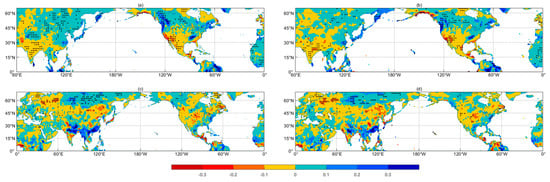 As in Section 3.2, rainfall from CRU and GPCC are used for comparison as well (Figure 4c,d). In the positive phase of SPIMV, there is a notable reduction of rainfall over Western Russia and an increase of rainfall over central Russia and Northern India, consistent with ERA-20C. However, rainfall from CRU and GPCC increase remarkably over Southern China and Northern India and decrease significantly over central and Northeast North America, which disagrees with ERA-20C.