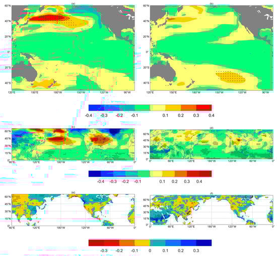Figure 6 displays the spatial pattern of NPIMV and SPIMV and their impact on the air temperature and rainfall in the model. The positive SSTA over the mid-latitude North Pacific for NPIMV and the positive SSTA over the mid-latitude South Pacific for SPIMV are captured in the model, with smaller areas than the observation (Figure 6a,b). The air temperature response to NPIMV in the model is different from reanalysis over the majority of the land (Figure 3a and Figure 6c), while the patterns of rainfall response to NPIMV in the model and in reanalysis are similar over North America and dissimilar over the Eurasian continent (Figure 3b and Figure 6e). Neither the air temperature response nor the rainfall response to SPIMV in the model agrees with the reanalysis in most regions (Figure 5a,b and Figure 6d,f). Therefore, the EC-ERATH model is able to reproduce the observed spatial patterns of NPIMV and SPIMV to a certain extent, but it cannot simulate their climate impact.