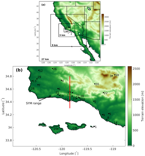 Downslope windstorms are frequently observed on the south-facing slopes of the Santa Ynez Mountains (SYM) in coastal Santa Barbara (SBC), CA [1,2]. The SYM range is about 100 km long and exhibits a predominant east-west orientation with peaks reaching between 800–1200 m. Despite its relatively narrow width (5–10 km), this mountain range plays a critical role in the local meteorology of coastal Santa Barbara, notably in the development of downslope winds. Locally, they are known as Sundowner winds (or “Sundowners”), due to the typical onset timing around sunset [2,3,4,5]. All major wildfires in coastal Santa Barbara have intensified under the influence of Sundowner winds. Despite its importance for firefighting purposes, evacuation strategies, aviation and navigation hazards, the existing network of ground stations is insufficient to examine mechanisms associated with the mesoscale evolution of these winds. Therefore, to advance understanding of Sundowner winds, it is imperative to assess the skill of mesoscale models in reproducing the main observed features, such as onset and end of events, timing of maximum intensity and spatial variability of the winds.