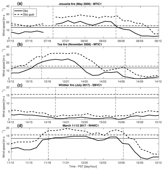 Observed wind speeds (solid lines) and gusts (dashed lines) for the selected Sundowner events during (a) the Jesusita fire, (b) the Tea fire, (c) the Whittier fire, and (d) the 11/12 March 2017 case study. Station location in each of the panel titles are given in Table S1 and Figure 1b. Horizontal lines indicate the thresholds for Sundowner wind criteria as used by NWS LOX. Vertical dashed lines denote astronomical sunset and sunrise times.
