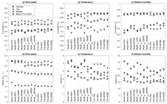 Larger scatter among configurations is found for temperature and relative humidity than for wind speed (Figure 3b,c,e,f). However, using higher values for in LSM also improves comparisons for temperature and relative humidity. Highest correlations and lowest RMSEs are found for most configurations using the PX LSM with small differences among the configurations using different PBL schemes. The Noah LSM (both standard and ) appears relatively more sensitive to a particular PBL scheme than the PX LSM. The QNSE and MYNN schemes show better comparisons with observations (higher correlations and lower RMSEs) especially for the Tea, Whittier and 11–12 March cases. The MYJ scheme underperforms in the Tea and Whittier case studies relative to other PBL schemes. We further note that the Noah- + MYNN combination performs within the error range of the PX runs, but that the Noah- + YSU configuration shows a relatively poor performance when compared to the Noah- + MYNN and PX runs.