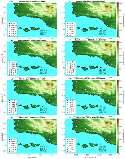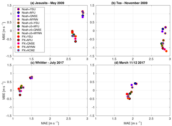 Figure 4 shows the statistical analysis for wind speeds for the four Sundowner cases, further generalizing [22] results. As discussed in that study, the different configurations show a large dependency on the use of : simulations using the standard Noah LSM with lower (blue dots) show higher wind speed biases than simulations with the higher (dark green and red dots). The skill of WRF in simulating winds during the Whittier and 11–12 March cases increases for the PX and Noah- LSMs (Figure 4c,d). The Tea fire simulations show an underestimation for the PX and Noah- LSMs (red and dark green dots), and a relatively good estimation for the standard Noah LSM. This is related to the general underestimation of winds at most stations (not shown).