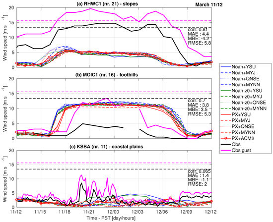 The airport (KSBA) is located about 3 km south of the SYM foothills (station 11 in Figure 1b), and some studies have indicated that Sundowners reach the airport only occasionally [1,16]. Observed winds were much weaker, but occasionally stronger winds with a northerly direction appear between 20:00 PST (11 March) and 01:00 PST (12 March); these were absent in the simulations (Figure 6c). The weak winds in both simulations and observations lead to relatively low values for MAE, RMSE and MBE, but also decreased correlations. We further note that both configurations using Noah LSM and YSU PBL show much higher values for wind speed throughout the night than the other configurations. Owing to the low availability of the observations, it is hard to discern whether this particular combination performs better or worse than others. We address this particular issue in the next subsections.
