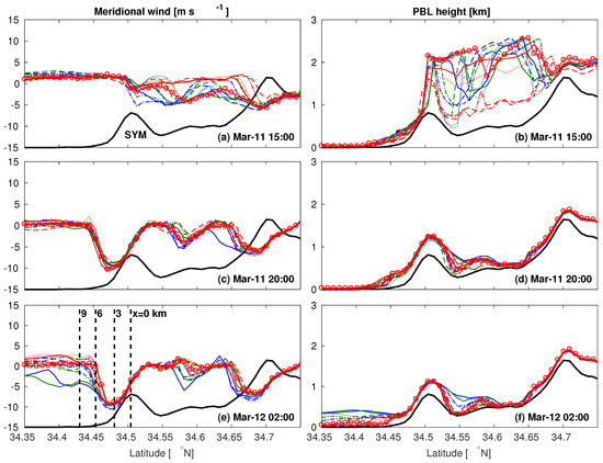 (a,c,e) Horizontal cross sections of meridional wind component at 10 m agl and (b,d,f) vertical cross sections of the PBL height for all configurations (see Figure 6 for the legend) at the indicated times (PST) for the 11–12 March case. The four vertical dashed lines in (e) are used in Figure 8, where the left dashed line indicates the airport location.