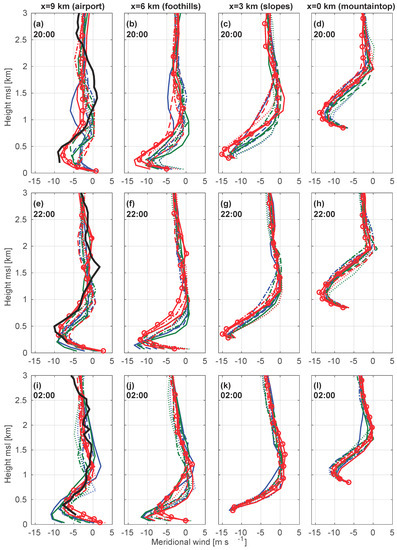 Time evolution of vertical profiles of the meridional wind during the 11–12 March Sundowner case study from observations (black line, only at the wind profiler location) and model sensitivity experiments (see Figure 6 for legend) for the (a,e,i) wind profiler, (b,f,j) foothill, (c,g,k) slope, and (d,h,l) mountaintop locations, see also Figure 7e for the exact locations of each profile. Times (in PST) are indicated in all panels.