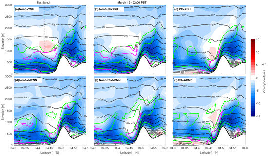 To further understand the differences among the configurations during the 11–12 March case, we discuss the horizontal cross sections of and meridional wind for a selection of configurations (Figure 9) at a time when largest differences between configurations were present (02:00 PST). The figure also highlights regions with a bulk Richardson number (computed based on adjacent model levels) lower than 1 (green contours) and lower than 0.25 (magenta contours). These indicate the presence of self-induced wave-breaking layers [48], and can be a crucial component for the development of downslope windstorms in the lee of the SYM [4].