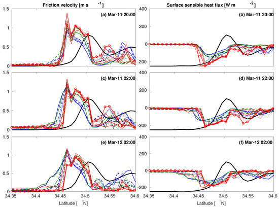 However, all configurations started with a stable marine boundary layer at the beginning of the downslope windstorm event at around 20:00 PST (this is shown by the PBL height in Figure 7d). Over time this was eroded by the Noah + YSU configurations (indicated by larger PBL heights over the ocean in Figure 7f and in Figure 9a,b). Interestingly, the marine layer has not been eroded in the PX + YSU configuration (Figure 9c). We recall that PX and Noah- share the same values for . However, the use of a different LSM leads to a different treatment of surface sensible heat flux H, which is intimately connected to friction velocity , especially during the night [49].