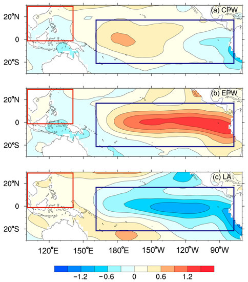 where [SSTA]A, [SSTA]B, and [SSTA]C indicate the SSTA averaged over the regions of (10° S–10° N, 165° E–140° W), (15° S–5° N, 110° W–70° W), and (10° S–20° N, 125° E–145° E), respectively. The EMI can also be downloaded (http://www.jamstec.go.jp/frcgc/research/d1/iod/modoki_home.html.en). After removing the linear trends of the indices, the CPW (EPW) events were associated with the maximum SSTA in the eastern Pacific and required the 5-month (JJASO months, from June to October) running means of SSTA in the EMI (Niño-3 index) region to exceed one standard deviation. Similarly, the LA events were defined by if the 5-month (JJASO months) running means of SSTA in the Niño 3.4 region were cooler than one standard deviation [33,34,35,36]. Subsequently, 8 years with JJASO characterized by CPW (1966, 1967, 1977, 1990, 1991, 1994, 2002, and 2004), 7 years with JJASO characterized by EPW (1965, 1972, 1982, 1987, 1997, 2009, and 2015), and 10 years with JJASO characterized by LA (1964, 1970, 1971, 1973, 1975, 1988, 1998, 1999, 2007, and 2010) were defined accordingly. The composites of SSTA for CPW, EPW, and LA events during the mature stage of ENSO are shown in Figure 1 (blue rectangle).