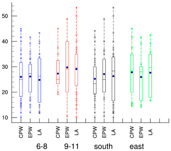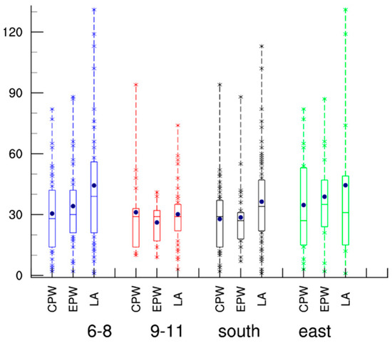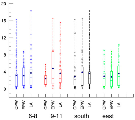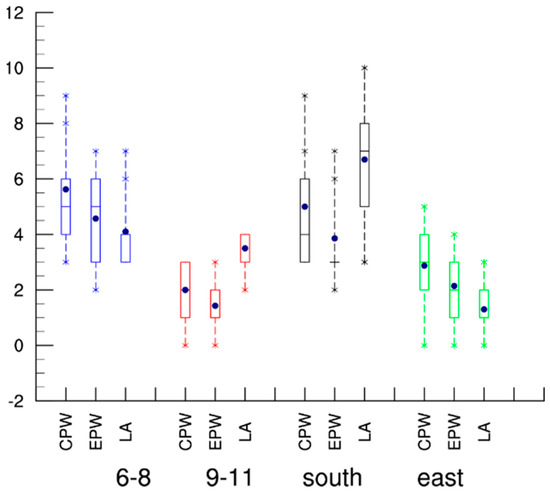 It can be seen that there were no significant differences in landfall intensity over SC and EC across EPW, CPW, and LA years (Figure 4 and Table 2), while during the autumn season, the landfall intensity (with the average of 28.7 m/s) was much stronger than that in the summer (25.67 m/s), especially in EPW and LA years. As for landfall frequency (Figure 5), the number of landfalling TCs in the summer was much greater than that in autumn. During the summer, the landfall frequency was highest in CPW years, while during autumn it was highest in the LA years compared with the other two ENSO events. According to the landing locations, there was an obvious tendency toward a larger number of TCs in CPW and LA years making landfall along the SC coast. Every year, an average of about 70% of TCs struck the SC coast [16]. In LA years, 84% of TCs (6.7) made landfall over SC, which was much higher than the mean, and the remaining 16% (1.3) struck the EC coast. Some researchers have proved that the westward shift in the mean genesis position, together with the strong subtropical ridge, favors a steering toward the South China Sea (SCS) [22]. In terms of the mean duration of landfalling TCs (Figure 6), it can be seen that the duration of TCEC was much longer than that of TCSC, especially during EPW and LA years. An explanation for this is that some TCs making landfall over the EC coast will be recurved and moved back over the ocean again, thus prolonging their lifetimes, and some other TCEC will interact with mid-latitude weather systems, such as the mid-tropopause trough, resulting in TC deformation. This process can also extend the life span of landfalling TCs. In addition, duration of TCs in summer is greater than that in autumn, especially in LA years.