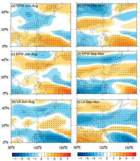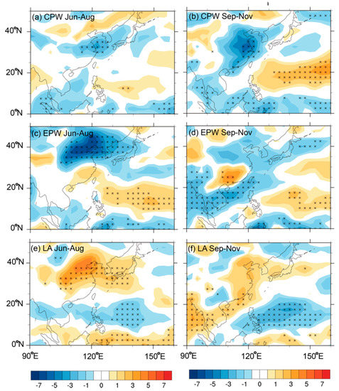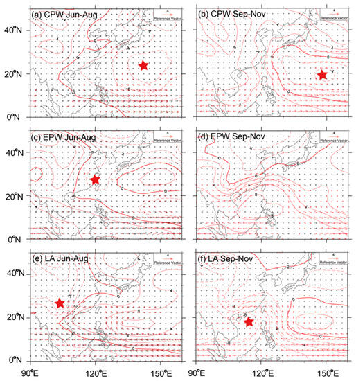 The movements of TCs are largely controlled by the surrounding environmental flow in the troposphere. An integrated flow through a layer of the atmosphere from 850 to 300 hPa is usually defined as the TC steering flow [35]. A composite of wind anomalies and geopotential height are shown in Figure 10. The 5880-gpm contour represents the position of the subtropical high [50,51]. The subtropical high in EPW and CPW years covered a larger area with a stronger intensity and extended farther westward in comparison to LA years whether in the JJA or SON seasons. However, during the late season of EPW and CPW years, the subtropical high split into two separate cells at about 130° N, which helped TCs to recurve north or northeast before landfall [22,52]. Thus, this partly explains the smaller number of landfalling TCs over China in the SON of EPW and CPW years. The TC steering flow in the JJA for EPW was associated with the westerly anomalies in the tropics and an anomalous cyclone along eastern China coast. This TC steering flow pattern was unfavorable for TCs to take a westward track and make landfall over China [35,36,52]. In CPW years, the TC steering flow showed weaker westerly anomalies in the tropics and the southeasterly anomalies over the China coastal area in the JJA season, which enhanced the possibility of TCs making landfall over China. Thus, in summer, there was an increased number of TCs making landfall over China in CPW years compared with EPW years. In autumn (SON) for CPW, the southeasterly anomalies changed into northwesterly anomalies, which was not conducive to landfalling TCs. The TC steering flow for LA years showed easterly anomalies in the tropics with weak southeasterly wind in summer and strong southwesterly wind in autumn over the southern coast of China. Because the TCs formed more westward, they may have been steered by strong easterlies to make landfall over China. Therefore, there were more TCs making landfall over southeast China in LA years, especially in autumn, which is consistent with the distributions of the observed TC activities [36].