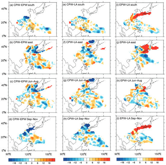 Composite of the differences of mean translation speed (km/h) for different seasons (JJA (c,g,k) and SON (d,h,l)) and different landing locations (SC (a,e,i) and EC (b,f,j)) during CPW, EPW and LA events.