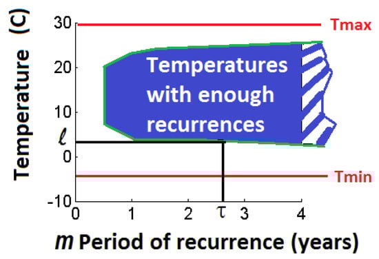 We assume that the climate variables have trajectories that wind around a chaotic attractor that contains the underlying dynamics of the system. We fix an arbitrary temperature and we consider the probability that the time series returns within a tolerance to . The return period is defined as the average time it takes for the time series to "hit" this interval. More precisely, the recurrence technique computes the probability Pr that the variable T returns in an interval of radius centered in : .