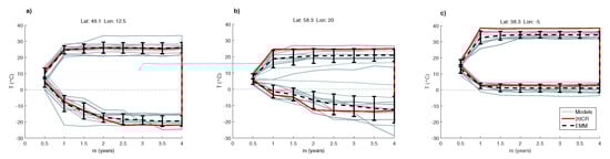 We illustrate the capabilities of the method by showing the results for three specific locations over Europe (Figure 2). Here the curves represent the spectrum for a grid point in central Europe (a), northern Europe (b) and southern Europe (c). The different shapes of the red lines (20CR), describing the area of normal recurrences, are explainable in terms of the climate characteristics of the grid points considered. Central Europe (a) features a continental climate with very cold extremes of temperature, being C rare for a return time of 1 year while C becomes normal for higher return times. From 1 to 4 years of return times, C are normal temperature in warm extremes. The grid point of Northern Europe (b) is located close to the Baltic sea showing mild temperatures in comparison with a more continental Northern point. Even though, the shape of red line shows cold extremes of temperature reach C for normal recurrences in return times of 2–4 years and 20 C for warm extremes in return times of 1–4 years. Temperatures lower than C are rare for return time of 1 year or less. Southern Europe grid point is located in Guadalquivir valley, presenting very hot extremes of temperatures reaching 40 C as normal recurrences from 1 to 4 years of return times. Cold extremes instead are rare for temperatures lower than 0 C. All the models show that return levels for hot temperature extremes are similar for years (Figure 2). The EMM and the SDM shows similar behavior with ℓ almost constant for years.