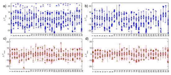 Box plots of the biases in (a,b in blue) and (c,d in red) between models and 20CRv2c in 1900–1999. Numbers in x-axis correspond to CMIP5 models ordered from highest to lowest resolution. Central marks are the median, the edges of the box are the 25th and 75th percentiles, the whiskers extend to the most extreme data points not considered outliers, and outliers are plotted individually. Different bin length m are represented: 1 year (a,c) and 4 years (b,d). Detailed statistical information about this figure in Table 3.