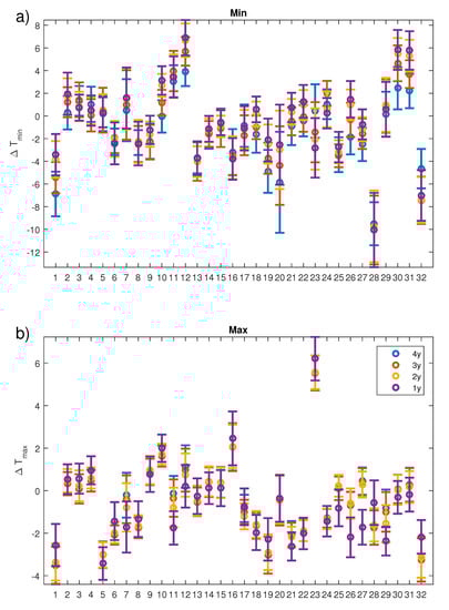 We consider 100 years (1900–1999) of daily temperature data for the whole year. This allows testing return times m between 6 months up to 4 years []. For recurrence windows longer than 4 years, we get less than 25 years of temperature recurrences and unreliable estimates of the Gumbel distributions. Conversely, events chosen for bin lengths shorter than 6 months cannot be considered as rare. We are dealing with non-stationary time series. However, the values of ℓ in the spectra are not on the tails of the distribution of which implied that the non-stationarity (about 0.5 C/century) does not affect the convergence to the spectrum.