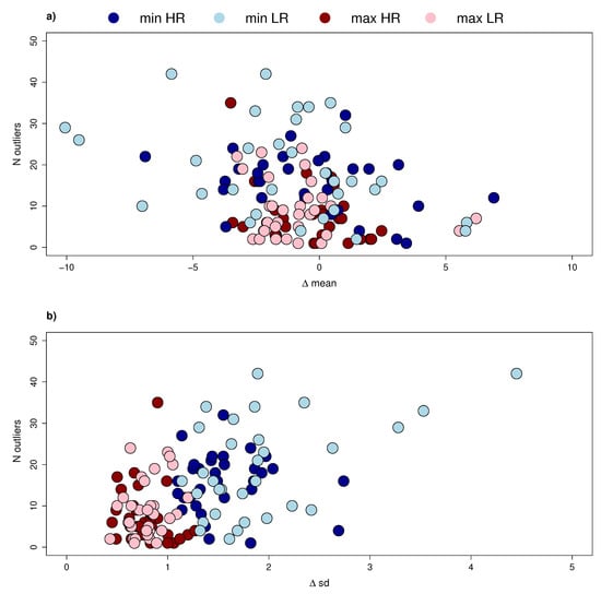 Number of outliers vs. (a) Mean of the biases (EMM) and (b) standard deviation (SDM) for each model and two bin lengths (, ). Dark blue represents cold temperature extremes for the 16 models having higher resolution while light blue represents cold temperature extremes for the 16 models at lower resolution. For hot temperature extremes, dark red represents higher resolution and pink lower resolution. Detailed statistical information in Table 3.
