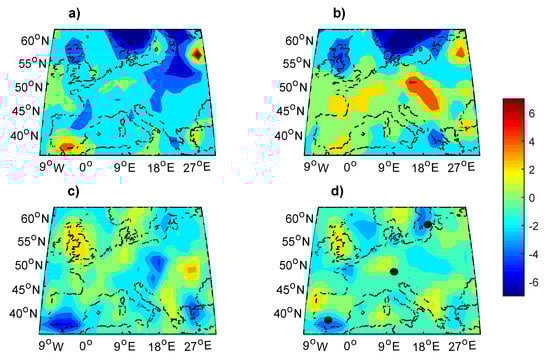 Average biases of models EMM for (a,b) and EMM (c,d) with respect to the 20CRv2c return levels. Different bin length m are represented: 1 year (a,c) and 4 years (b,d). Detailed statistical information about this figure in Table 3 (Ensemble). The three black dots in (d) correspond to central (Figure 2a), northern (Figure 2b), and southern (Figure 2c) points of Figure 2.