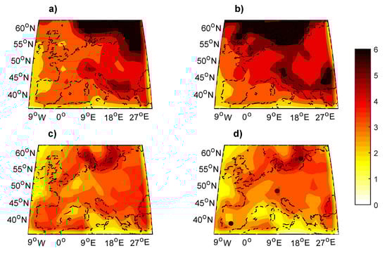 We focus now on the spatial distribution of biases in order to investigate their coherence. We concentrate on two quantities: the average biases of models EMM, obtained as the difference between the ensemble mean and 20CR return levels at each grid point (Figure 6), and the SDM at each grid point (Figure 7). Following the same structure of Figure 3, Figure 4 and Figure 5 and the cold extremes (Figure 6a,b) show larger deviations than the hot extremes (Figure 6c,d). This analysis shows the geographical distribution of biases: for the cold extremes, the Southwestern Iberian peninsula shows the largest positive biases, while for the largest negative biases occur in the Scandinavian region. The SDM (Figure 7) shows a coherent spatial structure for both the cold extremes (a, b) and the hot extremes (c, d). For the cold temperatures, larger biases appear mostly in the Scandinavian peninsula. For hot temperatures, biases are in general small for both and year, except at some specific grid points where they are mainly concentrated over the Baltic sea.