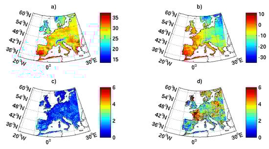 Recurrences analysis for eight EURO-CORDEX runs at m = 1 years. Average biases of models (a) for hot temperature extremes EMM for (as in Figure 6c for CMIP5) and (b) for cold temperature extremes EMM for (as in Figure 6a for CMIP5). Standard deviation of the biases of models (c) for hot temperature extremes SDM for (as in Figure 7c for CMIP5) and (d) for cold temperature extremes SDM for (as in Figure 7a for CMIP5).