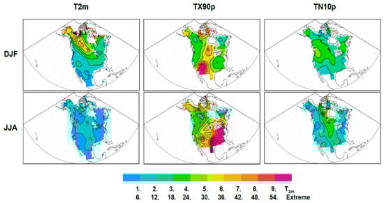 Percentages of North American T2m variance and temperature extreme variances explained by the teleconnections considered. Numbers outside and inside parentheses are the results in DJF and JJA, respectively.