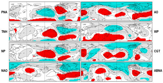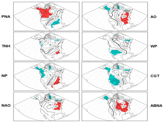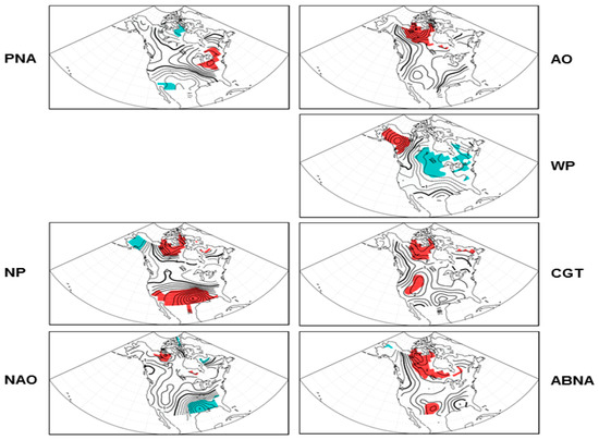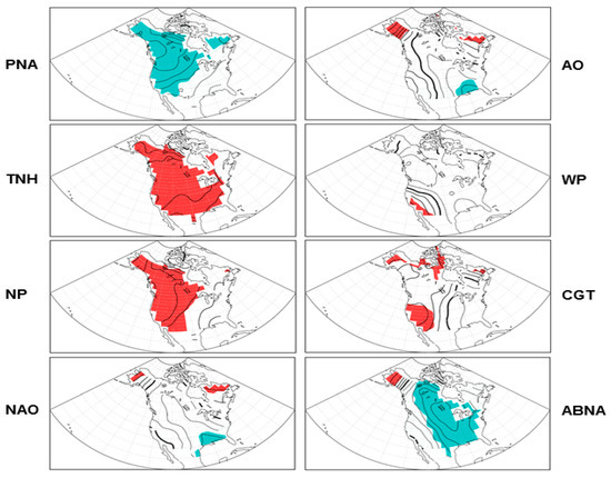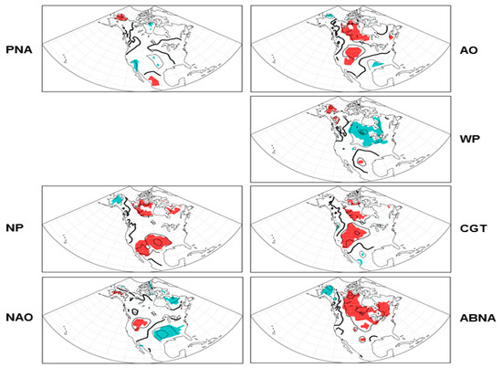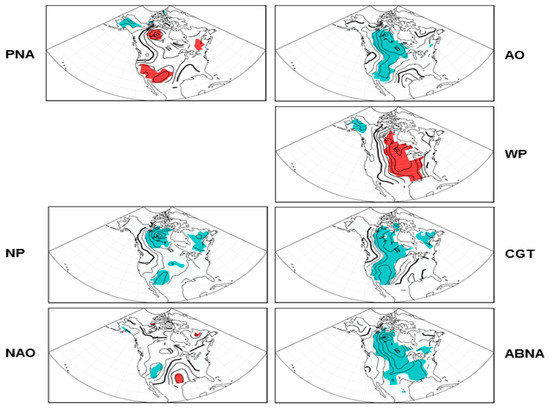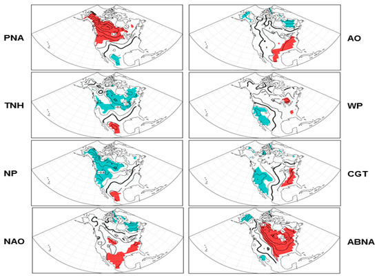 The teleconnection pattern reflects large-scale changes in the atmospheric wave and jet stream patterns, and hence, has pronounced influences on temperature, precipitation, and storm tracks over various regions of the globe [15,16,17,18]. In particular, the exchange of mid-high latitude air implies a change in temperature advection, which influences and partially supports surface temperature changes. In this study, we examine and compare those patterns that have significant circulation anomalies over the North Pacific–North American–North Atlantic sector, as listed in the next section, which tend to influence the temperature and temperature extremes over North America.