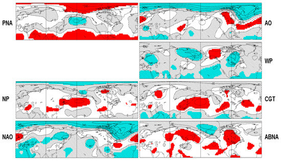 The WP pattern is a primary mode of atmospheric variability over the North Pacific [3,5] and consists of a north–south dipole of Φ500 anomalies, with one center located over the Kamchatka Peninsula and another broad center of opposite sign over southeastern Asia and the western subtropical North Pacific (Figure 2). The CGT is a circumglobal waveguide pattern and has a roughly zonal wavenumber-5 feature, meridionally confined to the vicinity of the northern jets [7]. The CGT associated Φ500 anomalies feature zonal asymmetries with centers of action over southern Europe, the Arabian Sea, the Korean Peninsula–Japan, north of Hawaii, and north of the Gulf of Mexico (Figure 2). The ABNA is an extratropical circulation anomaly pattern, constructed by excluding the PNA pattern contribution on the circulation and proposed to help understand the North American temperature variability [8]. The pattern consists of a zonally elongated wave train, originating from North Asia and flowing downstream across the Bering Sea and Strait towards North America. The ABNA shares some similarities of Φ500 anomalies with the AO pattern over the mid-high latitudes, with the WP over the Kamchatka Peninsula, and with the CGT mainly over the polar regions. Hence, the corresponding pattern indices are correlated (Table 1).