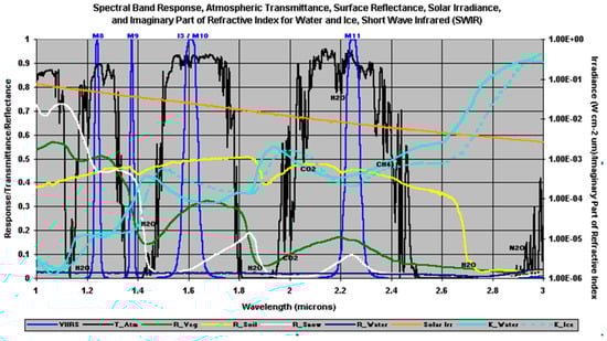 Figure 2 provides an overview of the phenomenology exploited in the image segmentation process in order to construct an MGCNC analysis. It contains the spectral signatures of cloud particles and surface backgrounds in 1.0–3.0 micron range. Similar figures are available in Baker (Figures 1–4) [24] and Hutchison and Cracknell (Figures 4.8–4.11) [11] for all VIIRS imagery (I) and radiometric (M) bands that collect energy from the near-UV to the IR bands, i.e., the 412–12,013 nm range.