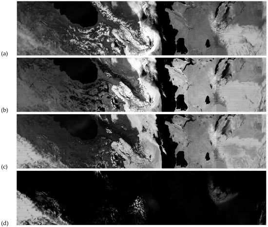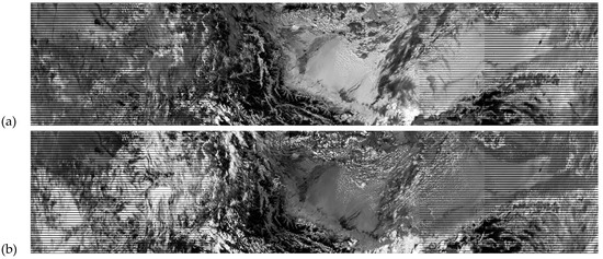 Finally, the contrast between middle and high altitude clouds is maximized in the VIIRS M9 band (with a bandwidth of 15 nm and centered at 1378 nm and shown in Figure 7d), while poorer contrast is seen in the corresponding MODIS band 26 (with a bandwidth of 30 nm and centered at 1375 nm) found at Figure 7e. (Note Figure 7d,e are not spatially or temporally collocated but are within about 20 min of each other in collection times.) In fact, the outline of the Caspian Sea is clearly visible in the MODIS image because the wings of this band extend into regions of relatively low atmospheric absorption as might be inferred from Figure 2. Thus, the surface reflectance is higher in the MODIS band, compared to the VIIRS M9 (1378 nm) band, so the contrast between clouds and the cloud free atmosphere is diminished in the MODIS band. Thus, to maximize the contrast between higher altitude clouds and all land surfaces, the VIIRS M9 band is the optimum band for exploitation. However, it is emphasized that the sensor bandpass should not exceed 15 nm in order to obtain the highest quality imagery with this band.