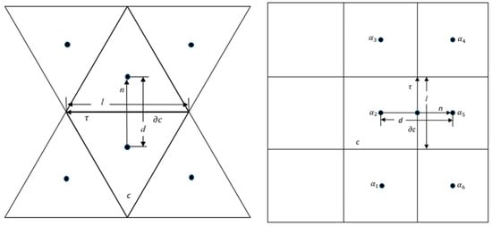 Now, we look into the discrete forms (10), (14), and (15) of a centroidal Z-grid model in solving Equation (20). Equation (20) mainly involves calculating a Laplacian operator. For a uniform grid with a grid spacing of in both and directions, a Z-grid model places the model states at the center of a square cell. The Z-grid model should approximate over a cell by using the Laplacian relation