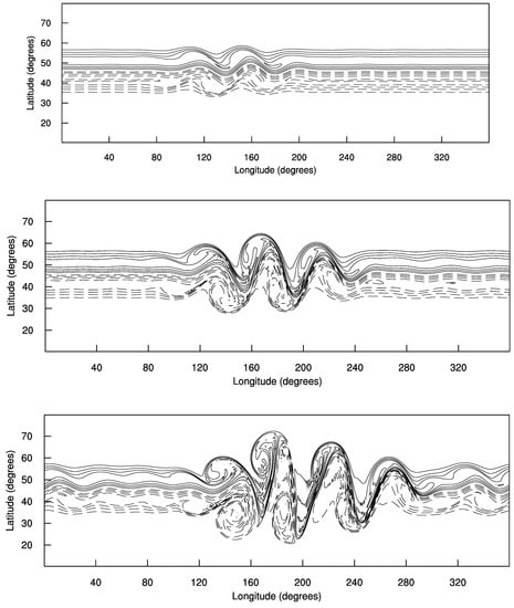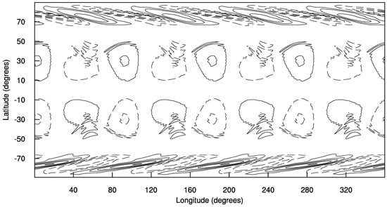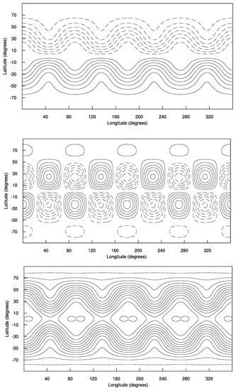 A mean constant height, m, was added to the solution of (40) so that the mean average height was around 10 km, as suggested by Galewsky et al. []. All the partial derivatives were treated as a Cartesian coordinate of instead of a spherical coordinate.