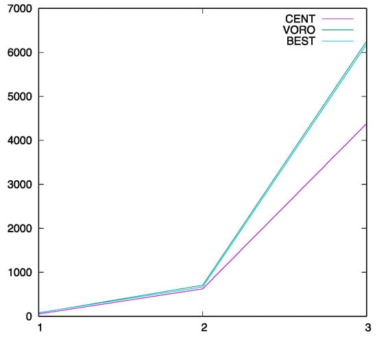 Computer runtime in seconds for the Rossby–Haurwitz case: 1. two-degree resolution; 2. one-degree resolution; and 3. half-degree resolution. CENT, centroidal; VORO, Voronoi; BEST, best.