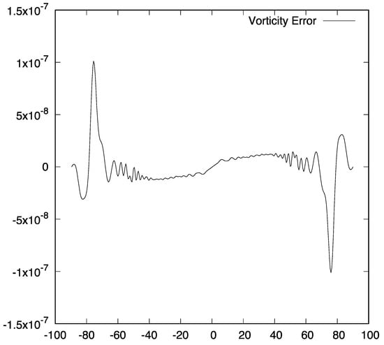 As we know the exact solution of the forced shallow-water Equations for the Rossby–Haurwitz case, we calculated the errors against the true solution of at the end of the 14th day in two error norms: and . In the error table (Table 2), the -norm error is a relative error and is defined as