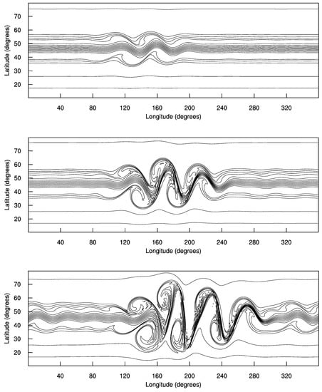 Figure 3 shows the stream function given by Equation (32), along with its absolute vorticity and fluid depth of the continuous Rossby–Haurwitz test case on the latitudinal/longitudinal plane in a one-degree resolution. For the Galewsky case, the background flow is given in Equations (38) and the solution of (40) and the perturbation (39) is shown in [].