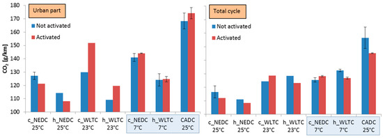 Figure 1 presents the results of CO2 emissions with the retrofit activated or not activated for various test cycles (NEDC, WLTC or CADC), with engine cold or hot start, and at two ambient temperatures (7 °C or 23–25 °C). The results for the whole cycle (right panel) or only the urban part (left panel) are separately plotted. Higher emissions during the urban part with cold start and the retrofit activated can be attributed to its heating. There is no clear trend of the effect of retrofit on the CO2 emissions for the complete cycles. For the NEDC the emission levels were similar with or without retrofit, while for the WLTC the CO2 emissions are slightly higher with the retrofit activated. The differences can be attributed to experimental uncertainties (repeatability ±4 g/km as shown with error bars) and no conclusion can be drawn due to the limited number of repetitions. With the activation of the retrofit, the mean increase of CO2 for all urban cycles was 0.6 g/km and negligible for the full cycles.